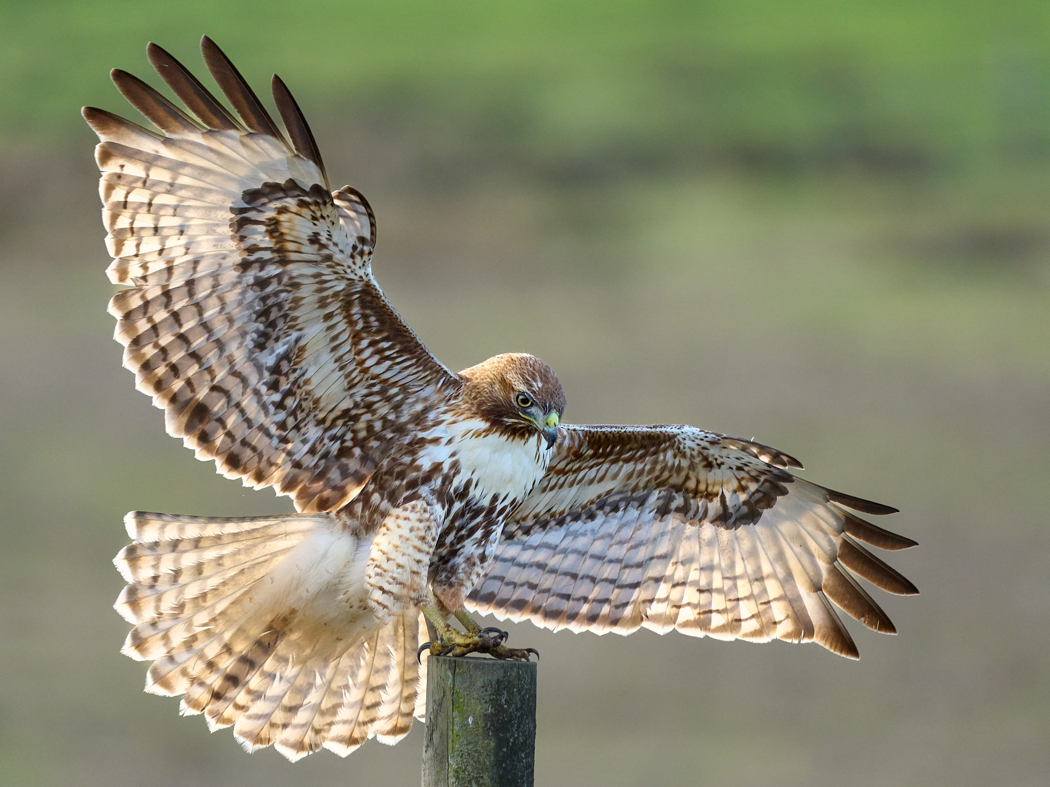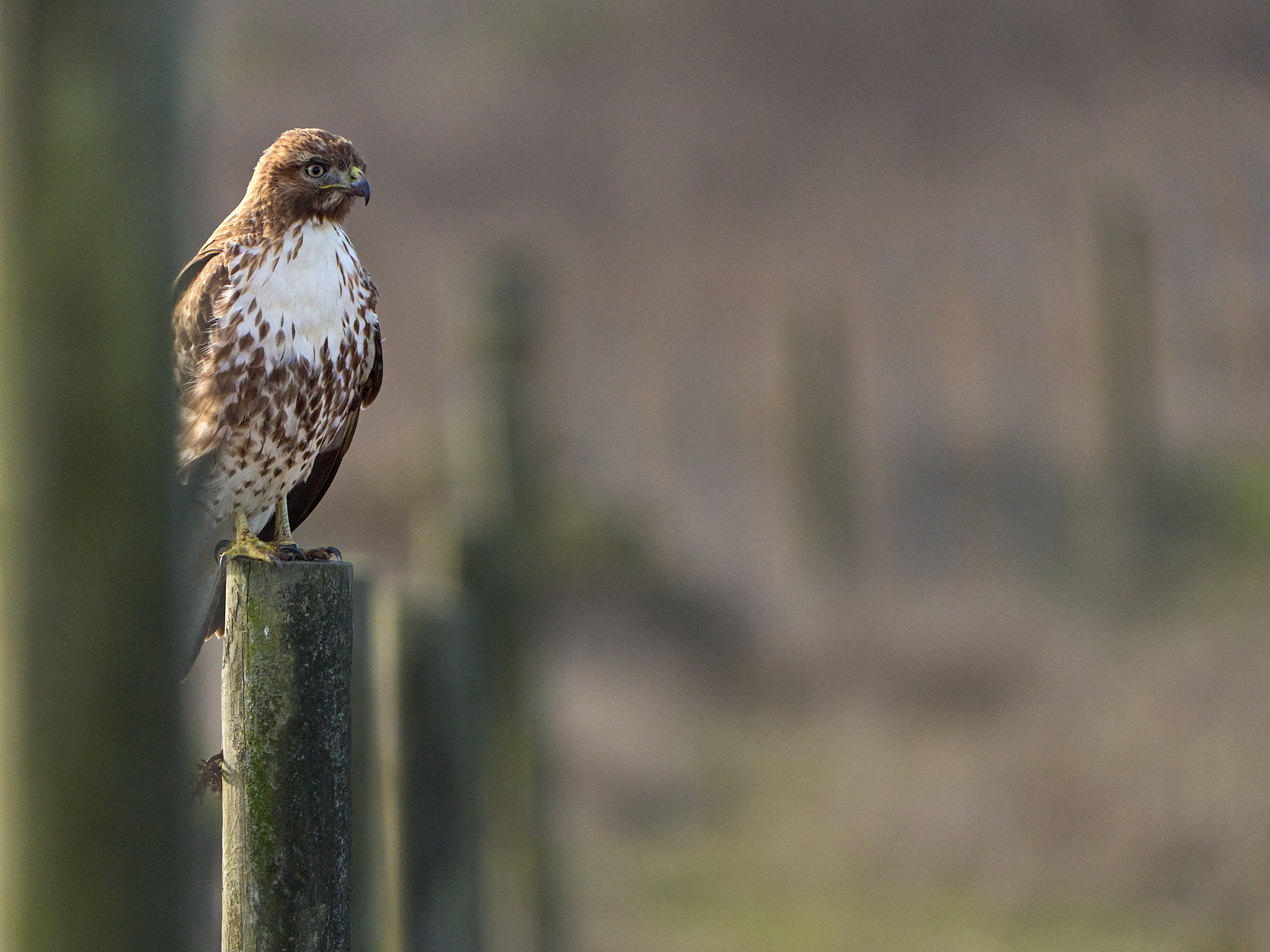 Our first stop was with an unusually tolerant Red-Tailed Hawk perched on a fence. I’ve photographed this individual before, doing some basic portraits and landscapes. We started with those same shots. The light was decently soft this morning, giving me better photos than on previous attempts.