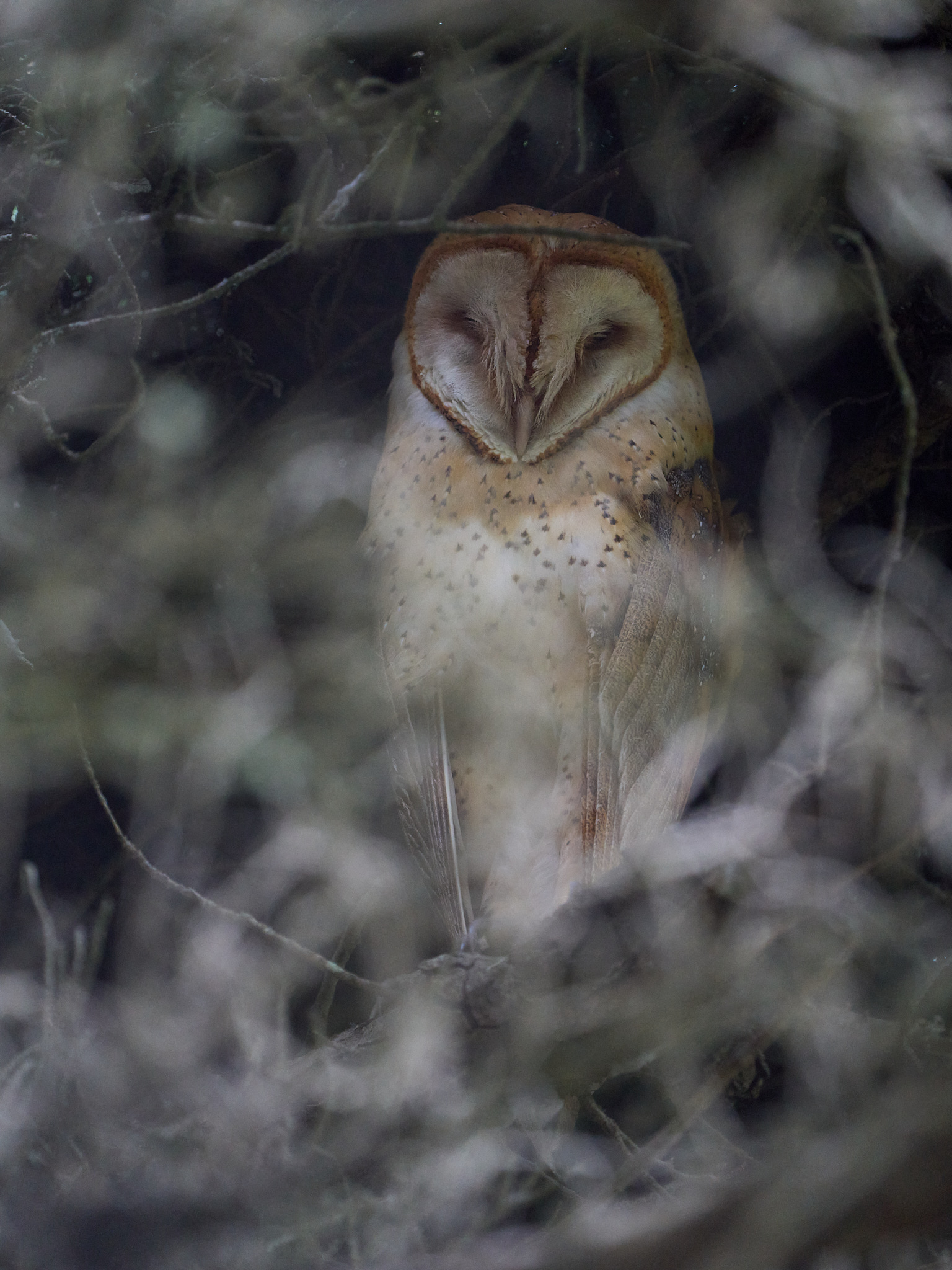 A day with a Barn Owl is always a good day, and Daniel had recently found a roosting spot. They’re very shy birds day and night. When roosting, they do their best to tuck in deep within trees so that it’s as hard as possible for larger predators (like Great Horned Owls) to spot them. If you find one roosting, you can often approach quietly, get a few photographs, and back off before your presence starts to disturb their rest.
