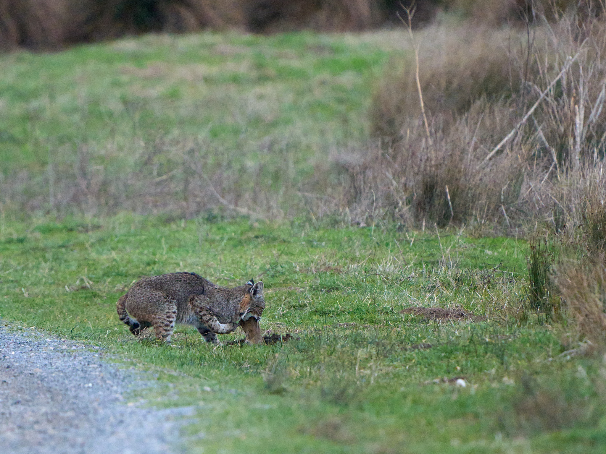 Firmly clutching her meal, the Bobcat walked almost directly towards the other photographer, passing within a few feet of him. What an incredible opportunity he got.