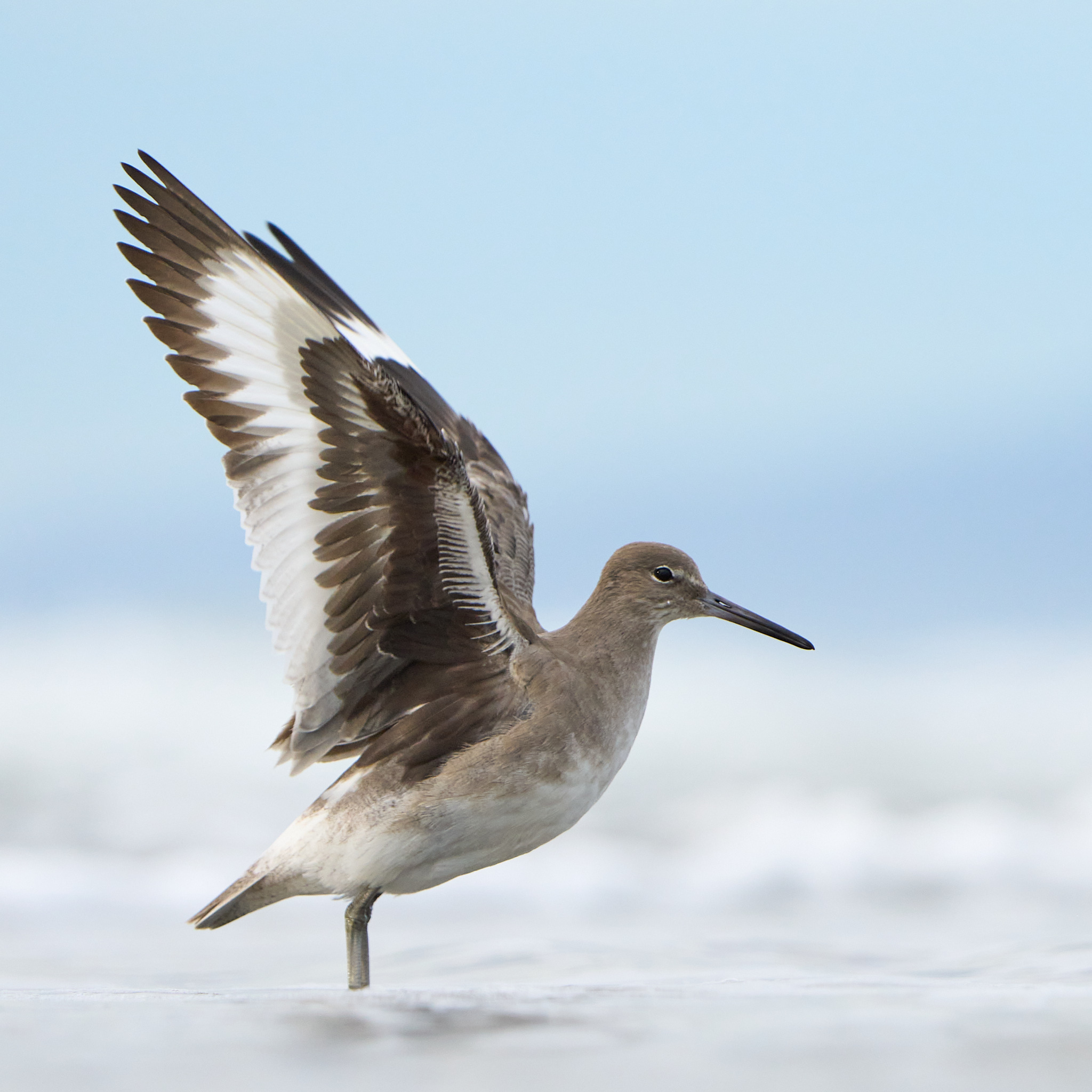 A Willet lifts its wing in preparation for liftoff. For whatever reason, all of my favorite Willet photos are dreamy lanscapes created by the foam of breaking waves.