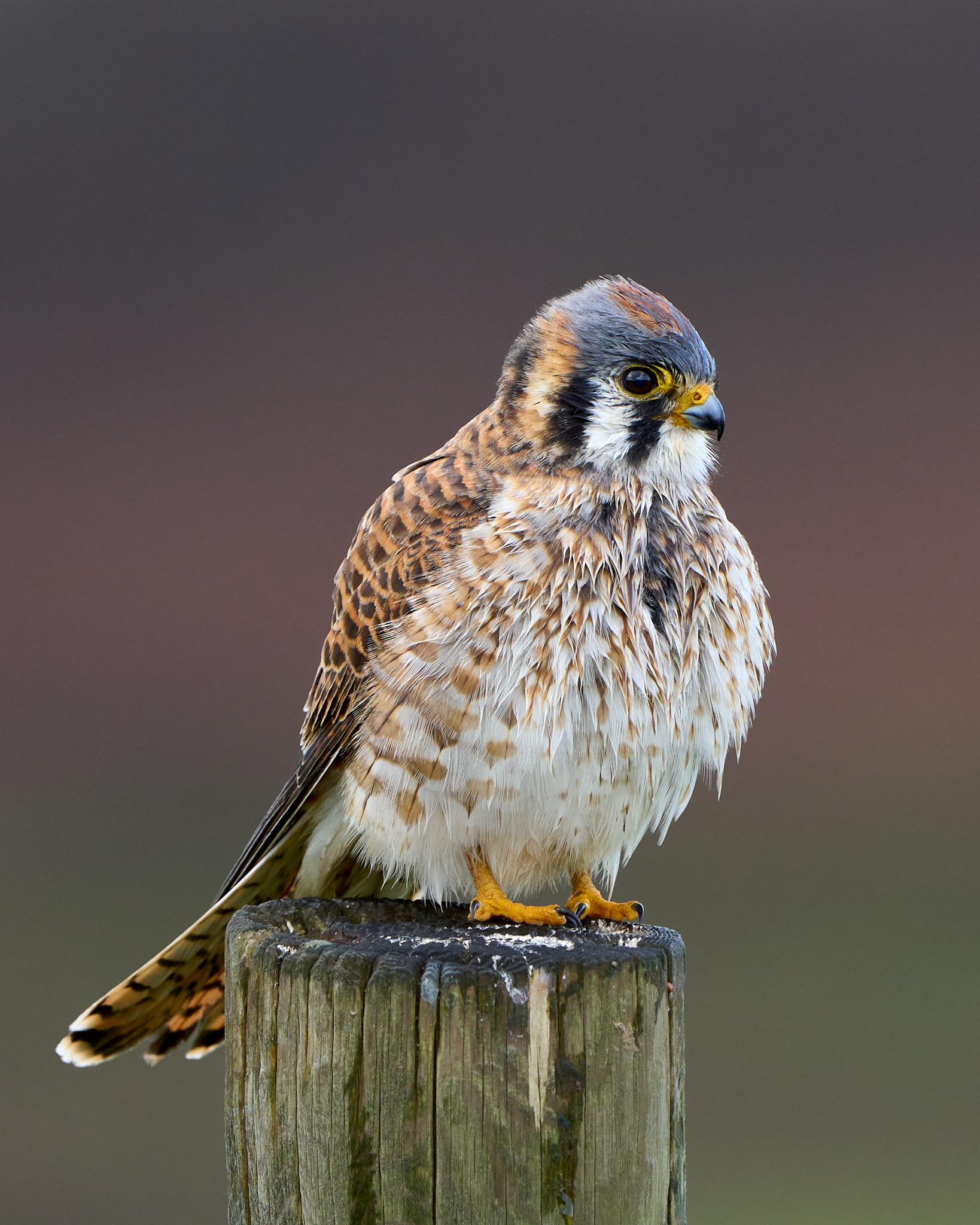 An American Kestrel who knows how to coordinate with her background. Starting today, I might switch to noting when my raptor subjects *aren’t* wet.