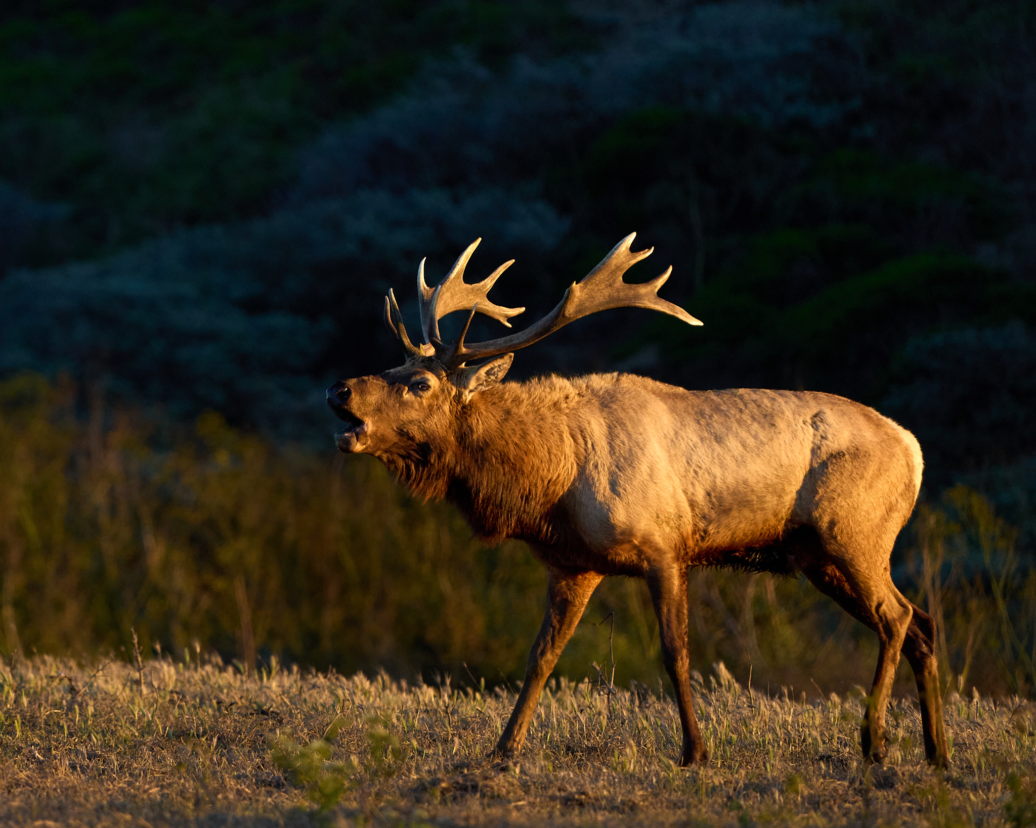 A Tule Elk bull bugles as the sunset sweeps down the coast.