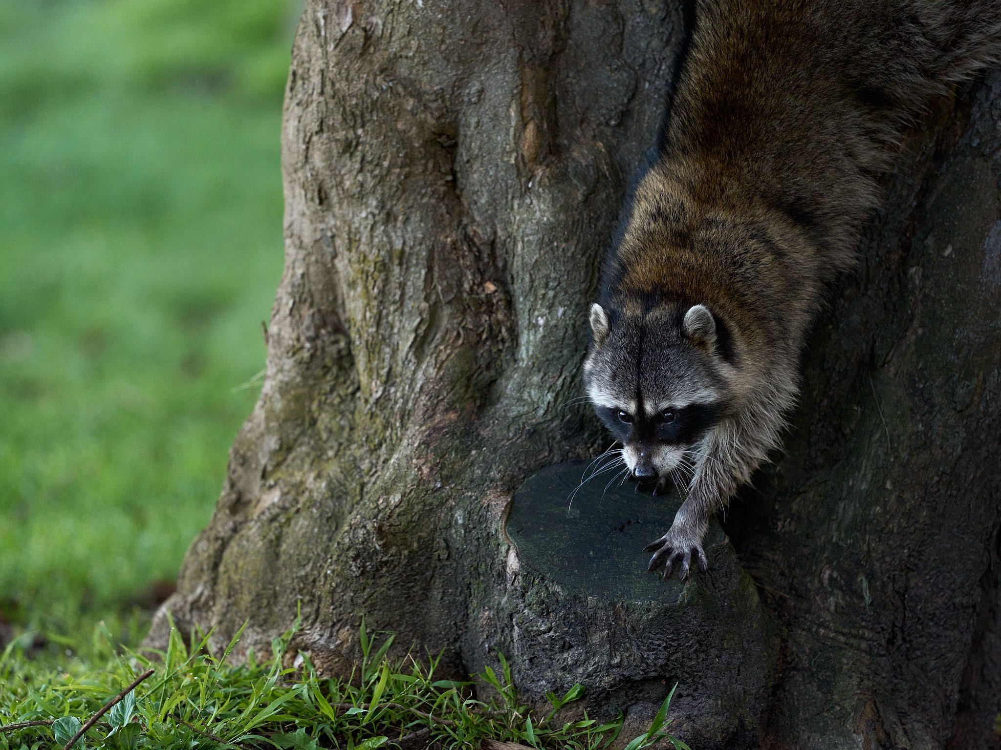 As the day starts, a Raccoon descends from a tree after an unsuccessful nest raid.