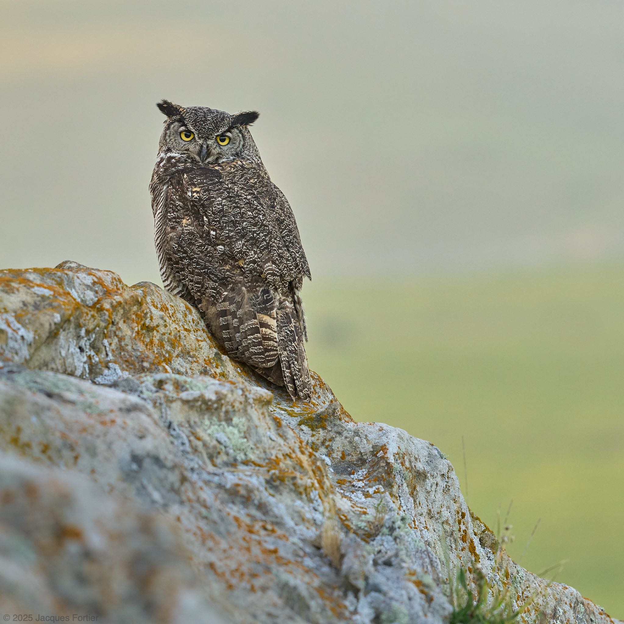 I found this Great Horned Owl hanging out on its favorite rock again. It had flown down from its tree well before sunset this time, giving me an opportunity to capture it with the fading glow of the day reflecting off the hills in the background.