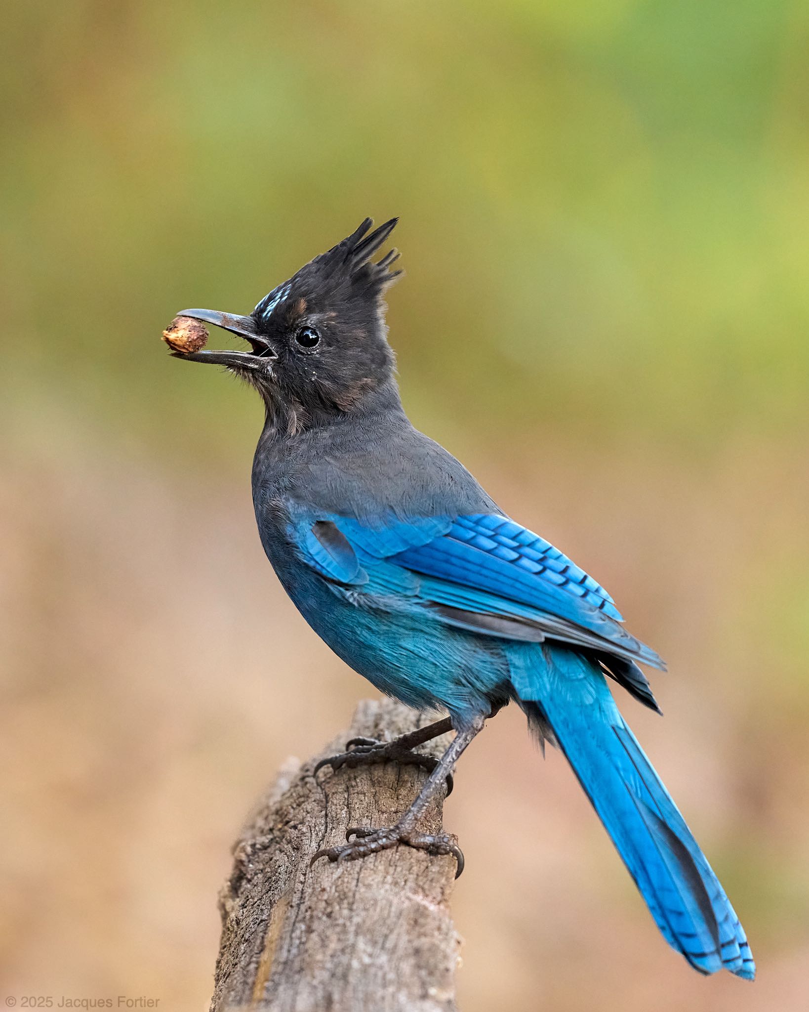I came upon this Stellar’s Jay and its mate early in the morning, digging a hole in the ground with their beaks. After a few minutes, one of them came up with a buried nut and hopped up onto a snag with a triumphant rattling call. I’d never never seen a Stellar’s Jay retrieve cached food before.